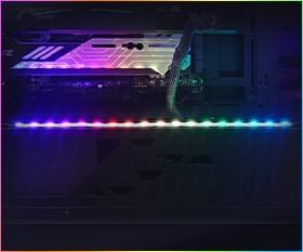 GPUアクリルプレートはグラフィックスカードの下部に設置され、イルミネーションを楽しむことができます。ライティングは専用ソフトウェアでお好みのカラーに調整が可能!この機会に、ぜひお得にドレスアップしたゲーミングPCを手に入れてください!