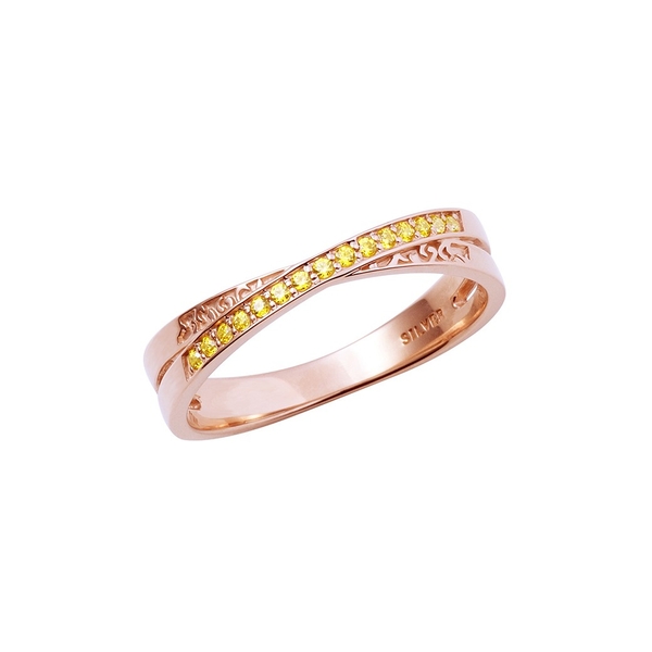 小川の指環(鞭)はレトロなピンクゴールドコーティングを施した木目調のストレート型に、イメージカラーストーンを配しました。和柄で落ち着いた雰囲気のデザインです。