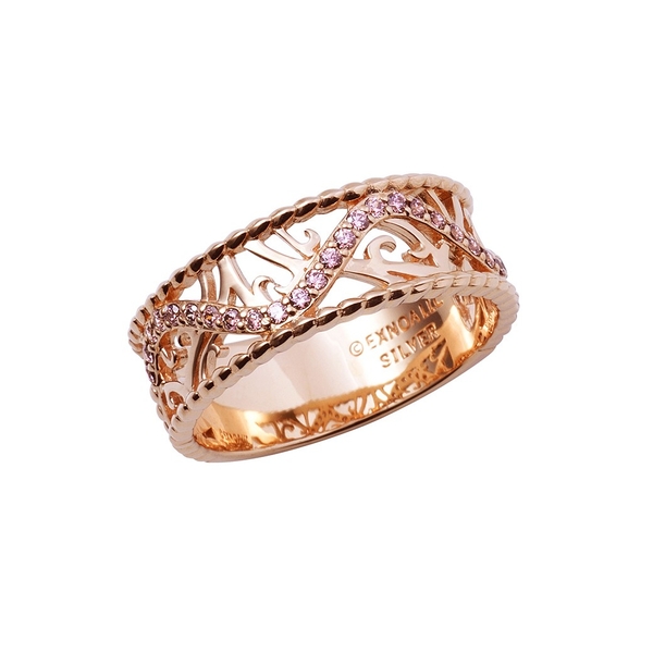 坪内の指環(鞭)はレトロなピンクゴールドコーティングを施した透かし柄の型に、