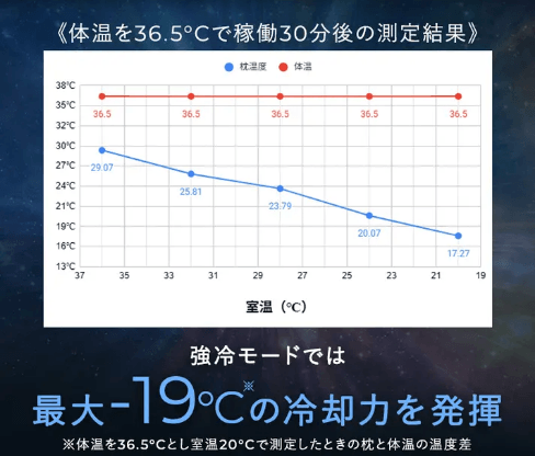 冷たさの秘密は、人工衛星の温度制御にも使われている「ペルチェ素子」。ペルチェ素子の、電流を流すと片面は吸熱により冷たくなり、反対面では放熱するという特性を、サイバーチルピローの冷却システムに応用しました。これにより最大で-19℃という驚異の冷却力を実現しました。