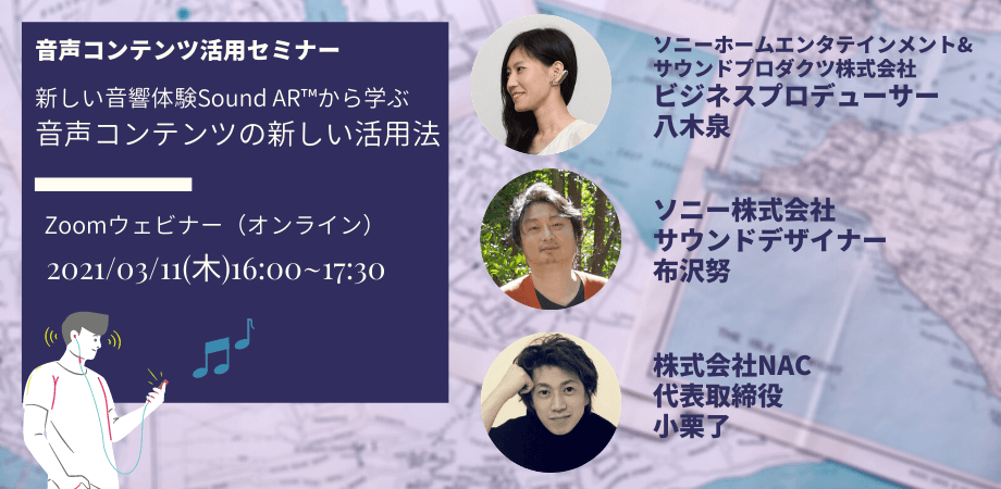 「地球まるごとテーマパーク」というテーマの体験型コンテンツ「Locatone™(※1)」は、ソニーが2020年11月にリリースした新しい音声ARサービスであり、特定のエリア・スポットを訪れると、キャラクターボイスやBGMが自動的に再生されるシステムとなっています。過去にはアニメ作品と地域が連携し、作品の舞台にもなったゆかりの地を案内するイベントが行われるなど、将来性の高いコンテンツです。本セミナーでは講師としてソニーホームエンタテインメント&サウンドプロダクツ株式会社ビジネスプロデューサーの八木泉氏、ソニー株式会社サウンドデザイナーの布沢努氏、株式会社NAC代表取締役の小栗了氏の3名をお招きし、Sound AR™(※2)(※3)を活用した体験型の音声コンテンツの可能性や、音声コンテンツのつくり方について解説頂きます。