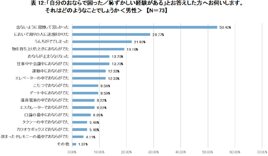 ①「我慢して苦しかった」(57.8%)、②「においで周りの人に迷惑をかけた」(22.4%)、③「物を持ち上げたときにおならがでた」(17.7%)が上位となりました。意図せず、うっかり出てしまったおならが原因で、つらかった、恥ずかしい思い出がある人も多いようです。男性は「うんちがでてしまった」(21.9%)が3位に。おならもれ(便失禁)症状には注意が必要です。