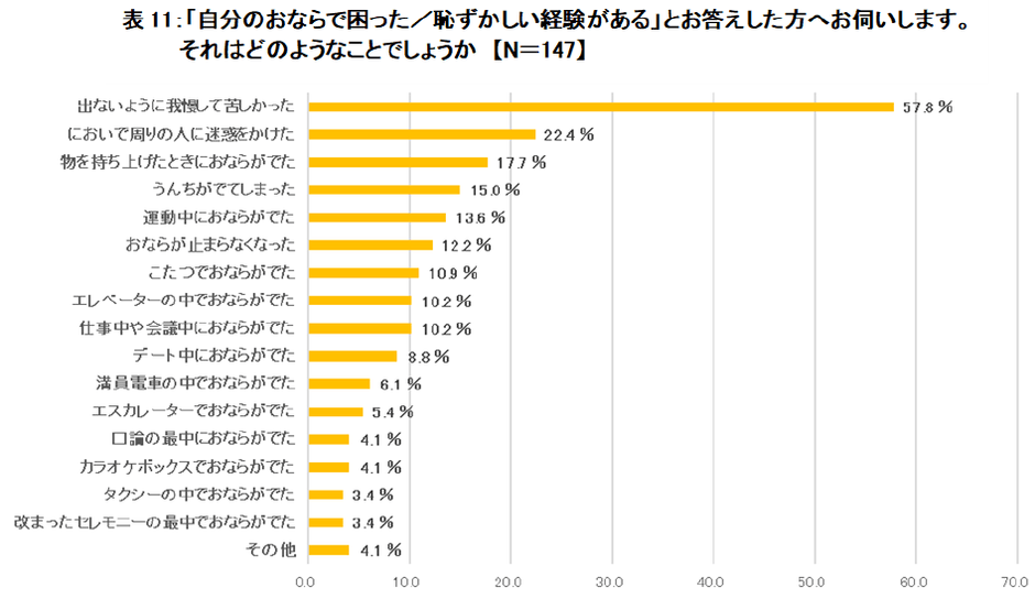 ◆1/3以上の人(36.8%)が、「おならで困った/恥ずかしい経験がある」と回答。「我慢して苦しかった」(57.8%)がトップ。
