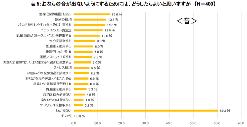 しかし「わからない」という解答も音・においとも多く、「音」(60.3%)、「におい」(53.5%)ともにトップ。気になるおなら対策ですが、実は対処方法がわからないという人が圧倒的に多くなっています。