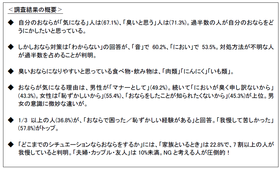 一方女性は、「恥ずかしいから」(55.4%)、「おならをしたことが知られたくないから」(45.3%)が上位。周囲に配慮する男性に対して、とにかく恥ずかしい、人に知られたくないという女性の、微妙な意識の違いがうかがえました。