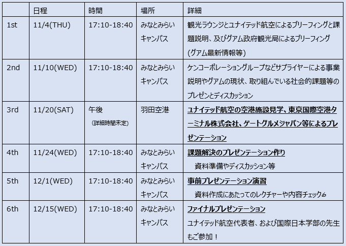 ・特別ゲストスピーカーによる講義。(グアム政府観光局様、東京国際空港ターミナル株式会社様、ケンコーポレーショングループ様、ゲートグルメジャパン様 他)