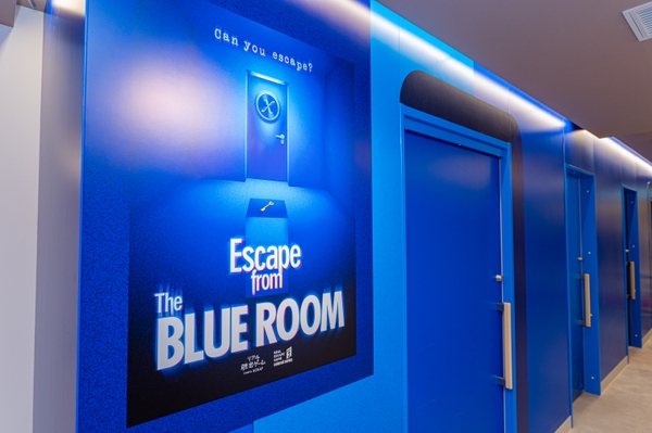 さらに、各イベントの外壁には、それぞれのメインビジュアルを反映した個性的な壁紙が施されています。例えば、青一色で統一された『Escape from The BLUE ROOM』や、水色とオレンジ色の長方形が鮮やかに配置されたインパクト抜群の『アイテムだらけの部屋からの脱出』など、テーマごとの特徴を活かしたデザインが魅力です。イベント参加後は、この壁紙を背景に脱出成功/失敗パネルを手に写真を撮り、ぜひSNSでシェアしてください!