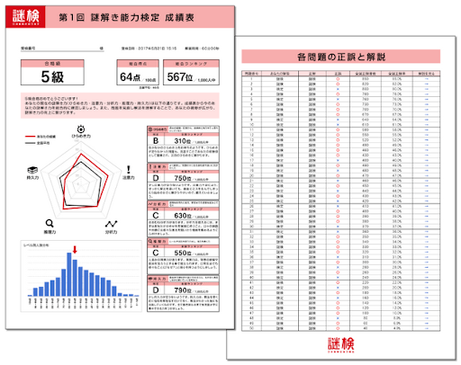 2024年12月5日(木)12:00(予定)に、総合得点とクラス判定、各問題の正誤と解説、また5つの謎解き力の細かい分析をした成績表を見ることができます。また、受検者のランキングを発表し、相対的に謎解き力を判断することもできます。この成績表はマイページから閲覧可能です。