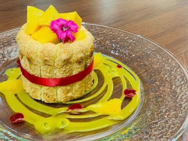 本日はブライダルWの1年生の授業で「マンゴー・シャルロット」を作成。