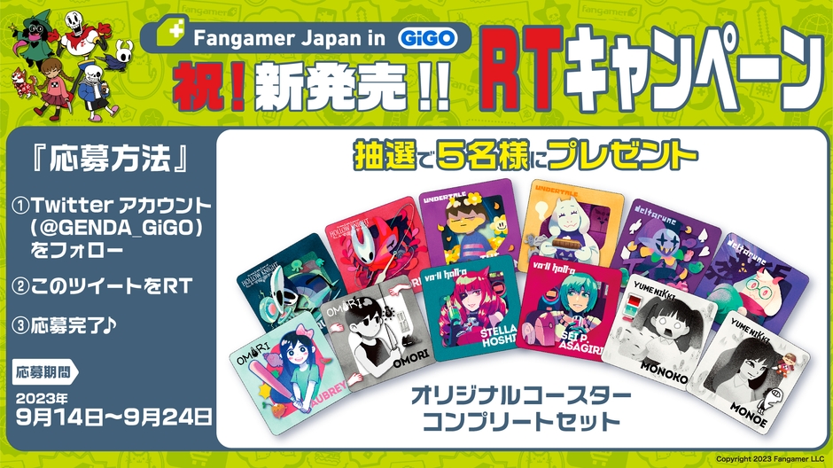 Twitterアカウント(https://twitter.com/GENDA_GiGO)をフォローの上で、該当のツイートをリツイートされたお客さまの中から抽選で5名様に「オリジナルコースターコンプリートセット(全12種)」をプレゼントいたします。
