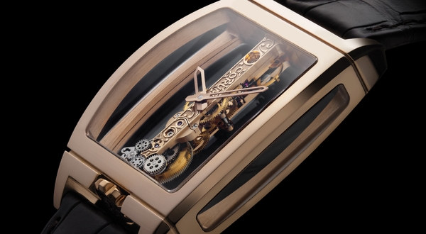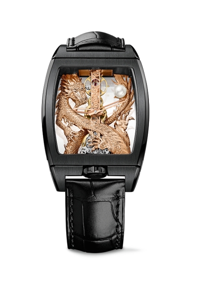 軽量のグレード5チタンにDLCコーティングを施し、ゴールドとのコントラストが映えるブラックカラーに。上品でクラシカルな印象を与えるトノー型ケースは、前面のみならず側面と背面もサファイアクリスタルで作り上げており、360度あらゆる角度から時計内部を鑑賞することができます。