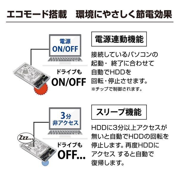 接続しているパソコンの起動・終了に合わせてHDDを回転・停止させる「電源連動機能」やHDDに10分間アクセスが無いと自動でHDDの回転を停止する「スリープ機能」も搭載しております。
