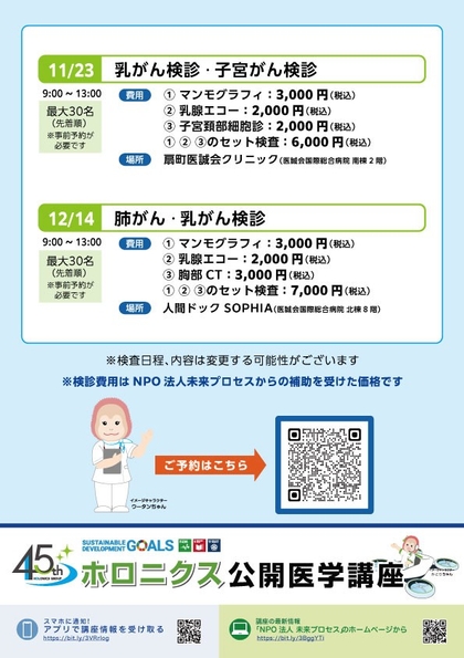 医療法人医誠会(本社:大阪府大阪市、代表者:谷 幸治)は、平日に受診が難しい方のために、医誠会国際総合病院で「週末検診」を実施しています。11月23日(日)は、定員30名の募集で乳がん検診と子宮がん検診を同日に受診いただけます。検診費用の一部は、同グループのSDGsを推進するNPO法人未来プロセスの補助により負担を軽減しています。経済的な理由で検診を先延ばすことなく、受診していただきやすい体制を整えました。