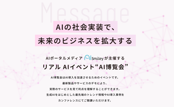 AIポータルメディア「AIsmiley」を運営するアイスマイリー(東京都渋谷区、代表取締役:板羽晃司)は、2025年3月27日(木)・28日(金)に「AI博覧会 Spring 2025」を開催します。