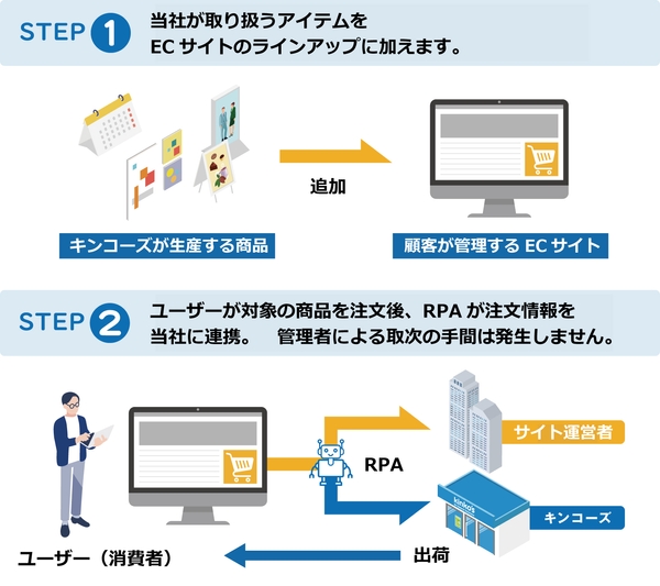 本サービスでは、当社が昨年開発した定型業務自動化ロボット(RPA)で、当社への発注・出荷指示を自動化します。これにより、サイト管理者は業務工数を増やさずに商品ラインアップの拡充ができ、運営負荷の削減を実現します。すでにECサイトを運営している顧客に対しては商品のラインアップの追加の提供を、EC事業を検討・計画している顧客に対してはECサイトの構築から支援をします。