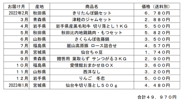 2月発送の秋田県の特産品「きりたんぽ鍋セット」からスタートし、青森の「サンつがる(りんご)」や山形の「佐藤錦(さくらんぼ)」、宮城の「仙台ちゃ豆」、福島の「野菜ボックス」、岩手の「冬恋(りんご)」など一年中東北6県の特産品をご自宅で楽しめるコースです。
