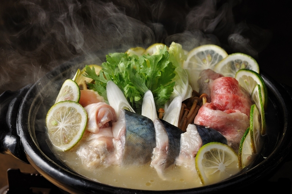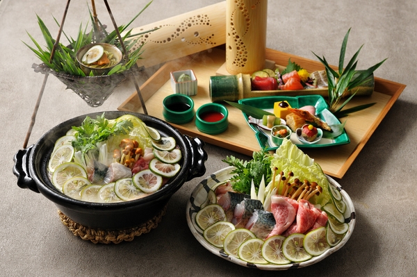 プライベートが保てる半個室の食事処で、ご当地の旬の素材をいかした会席料理を、大分県の伝統工芸品である焼きの器や竹細工とともに楽しめます。大分県の名産品「かぼす」を使った麺をアレンジした先付や、酢の物・八寸・お造りを一緒に盛り合わせた華やかな宝楽盛りは伝統工芸の竹細工を使用するなど、ユニークな提供方法で演出します。そして、特別会席のメインの台の物は「豊後なべ」です。近海で獲れた魚介と、鶏肉・牛肉を組み合わせ、鶏肉と相性の良いスープでじっくりと煮込みました。濃厚なスープに「かぼす」を入れることで、濃厚な味わいの中にも爽やかな風味を味わうことができます。