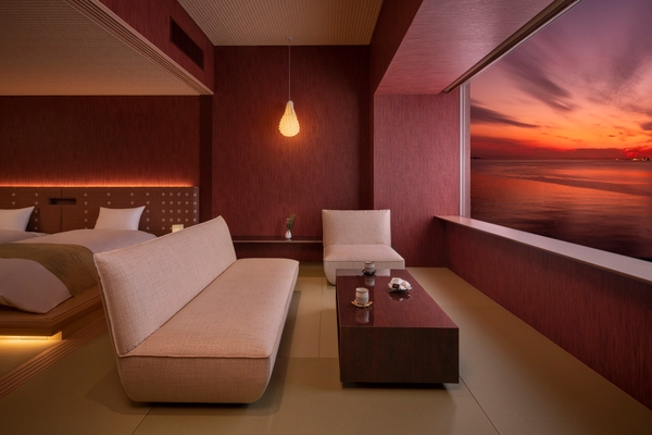 全70室の客室からは眼前に広がる別府湾を望むことができ、海を絵画のように楽しめる「ピクチャーウィンドウ」が特徴です。また、海の色を引き立てるために壁紙や障子、浴室のガラスには、別府の名所「血の池地獄」の赤から着想を得た古代色の「柿渋色」を用いました。これは、日本一の源泉数及び湧出量を誇る別府温泉の熱気や、温泉が湧きだす溶岩台地の土っぽさを表現しています。そして、室内には、豊後絞り(*)をヘッドボードやフットスローなどのインテリアに用いており、地域の伝統工芸や文化に触れることができます。