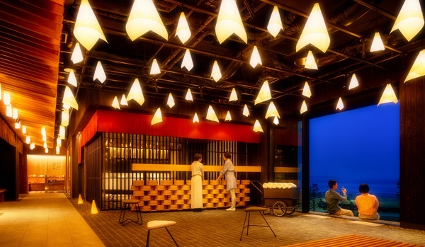 日本一の源泉数及び湧出量を誇る別府温泉。界 別府は、明治時代に旧別府港が開港して以降、日本全国から多くの湯治客が訪れた歴史ある北浜地区に位置しています。別府湾の玄関口、旧別府港を中心に温泉街が発展し、夜遅くまで人々で賑わう様子は「不夜城」と例えられてきました。湯治客が賑やかな温泉街をそぞろ歩きする様子を彷彿させるつくりとして、館内に石畳の路地や夜店をイメージした空間を配しました。また、別府温泉の豊富な湯を大浴場や客室露天風呂以外でも体験できるよう、足湯や桶をアレンジして造られた手湯を備えた「湯の広場」もあります。温泉街、湯の広場、客室などこのユニークな設計・デザインは、「」氏に依頼しました。地域の文化や伝統工芸などに触れ、ご当地ならではの魅力を体験してほしい、と考える温泉旅館ブランド「界」。そして、地元に根付く素材を使用し、周囲の環境に溶け込むことで新しい魅力を発信したい、と考える隈氏の理念が一致し、設計されたのが界 別府です。