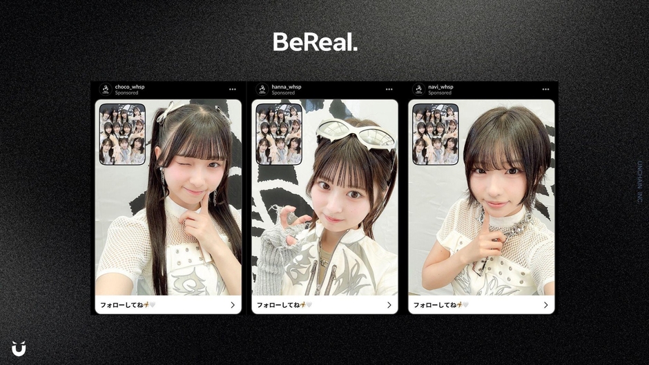 「世の中を“神ゲー”にして動かす」をミッションに掲げる、株式会社UNCHAIN(本社:東京都渋谷区、代表取締役:ウィン・レイ、以下UNCHAIN)は、2025年7月25日から8月8日に配信された、秋元康氏プロデュースの女性アイドルグループ「WHITE SCORPION」のBeReal広告のクリエイティブを制作しました。本施策は、メンバーのフォロワーを増やすことを目的に、BeReal公式アカウントを活用して行われた日本初の広告事例です。