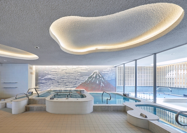 江戸遊の顔である大浴場は、女湯は紅の富士から広がる雲の世界で。男湯は荒々しい浪間に浮かぶ湯船で、ごゆるりとお寛ぎください。