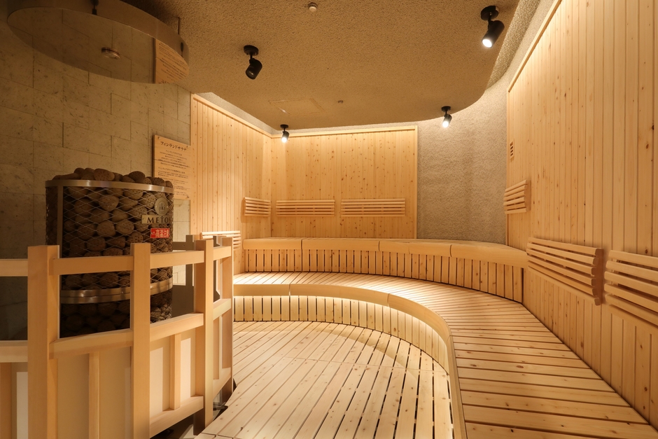 男湯・女湯ともに設置されている、90℃前後の本格フィンランド式ドライサウナは香しいヒノキの香りでリラックス。