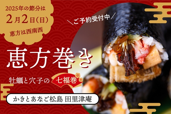「かきとあなご 松島 田里津庵(タリツアン)」(本社/宮城県仙台市 代表取締役 髙橋 弘行/タカハシヒロユキ)が、2025年1月10日(金)より恵方巻きの予約販売を開始しました。