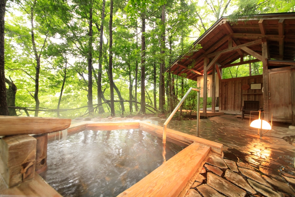約1万坪の自然林にたたずむ、ゆったりとした18室の離れ。豊かな自然と一体になれる自家源泉かけ流しの湯は、土地の地形や木々を活かした大風呂、4つの貸切露天風呂があり、季節・時間によってその表情を変えます。