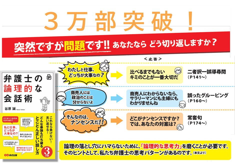 株式会社あさ出版(代表取締役:田賀井弘毅、所在地:東京都豊島区)は谷原 誠著『ポケット版 弁護士の論理的な会話術』https://www.asa21.com/book/b216619.html 3月4日の重版をもちまして、累計3万部を突破したことをお知らせいたします