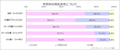 年賀状の宛名書きについては「PCで印刷」が66.4%、「手書き」が28.2%でした。年賀状を出す枚数別に見ると、20通以下の方では「PCで印刷」が55.7%に対し、21通~50通では68.1%、51通~100通では77.7%、101通以上の方では79.8%となりました。