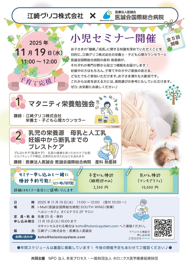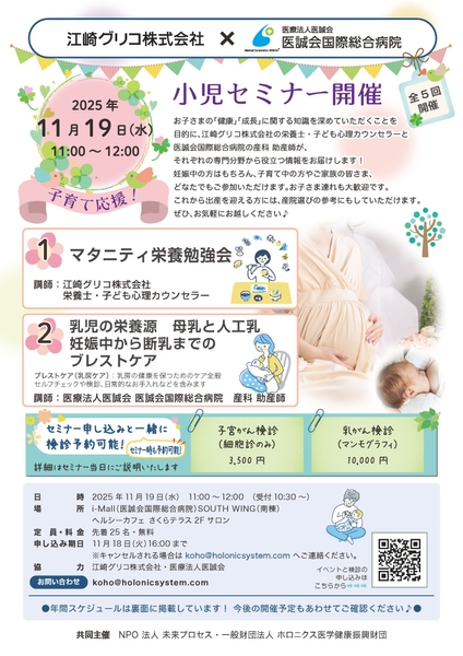 医療法人医誠会(本社:大阪府大阪市、代表者:谷 幸治)は、江崎グリコ株式会社と共同で、無料の小児セミナーを2025年11月19日(水)に開催します。会場は同法人が運営する医療複合施設「i-Mall」内のヘルシーカフェさくらテラスです。妊娠中や子育て中の方を中心に、関心のある人を対象とし、栄養士・子ども心理カウンセラーと助産師が栄養管理やブレストケアについて分かりやすく解説します。