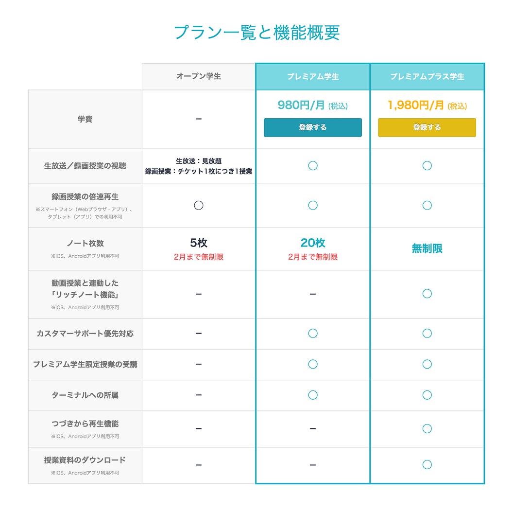 「授業資料のダウンロード機能」や「動画授業と連動したリッチノート機能」、 「つづきから再生機能」で学習効果の最大化を図る(月額1,980円)