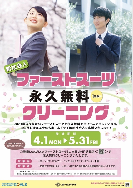神戸市須磨区に本社を置くホームドライは、新社会人に向けた「ファーストスーツ永久無料クリーニング」のキャンペーンを4月1日より開始いたしました。