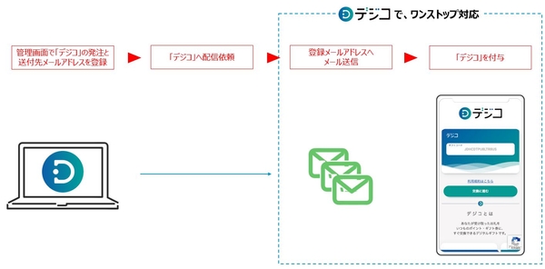 これまで「デジコ」導入企業がメールでインセンティブを配布する際、企業側でユーザーごとに個別のユニークなURLを送る必要があり、業務の大きな負荷となっておりました。「デジコ」の電子メール配信代行サービス(β版)は、「デジコ」の発券・配布先のユーザーメールアドレス登録までを管理画面で行い、「デジコ」へメール配信の依頼をするだけで、ユーザーへのメール配信は「デジコ」が無料で代行いたします。また今後は、「デジコ」の発券・配布先ユーザーメールアドレスの登録・メール配信日時の設定まで全てを管理画面で設定できる正式版を提供する予定です。
