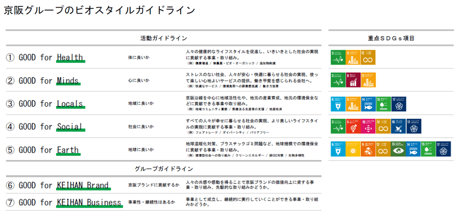 「BIOSTYLE PROJECT」は、“人にも地球にもいいものごとを、毎日の生活の中に、楽しく、無理なく、取り入れていくことができる明るい循環型社会の実現を目指す活動”で、「京阪グループにおけるSDGs達成に向けた取り組み」と位置付けるものです。2020年には7つの「GOOD」に基づく独自のガイドラインと社内認証制度を導入するとともに、2021年より「未来は、楽しく変えていこう。」を活動ステートメントに、取り組みの推進を強化・発信してきました。