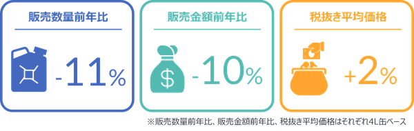 2024年4月の自動車用エンジンオイル販売は、販売量(リットル換算)ベースで前年比13%増と好調であった。ただ、4L缶の販売は数量前年比11%減と不調で、店頭が同11%減、インターネットでは同16%減と大幅に前年を割り込んだ。こうした中ではあるが、0W-16、0W-30の粘度の4L缶販売はそれぞれ数量前年比15%増、18%増と前年から大幅に伸長した。4L缶の税抜き平均価格は4,119円と前年同月から2%上昇した。店頭では3%上昇した一方、インターネットでは2%下落した。4L缶全体の金額前年比は10%減となり、店頭では8%減、インターネットでは18%減であった。