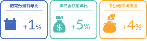 2024年4月の自動車用バッテリー販売は数量前年比1%増と微増で、店頭では2%減であったことに対し、インターネットでは6%増となった。規格別にみると、B20が数量前年比10%増、D26が同16%増と著しく伸長した一方で、B19は同2%減、B24は同7%減と前年を下回った。バッテリー全体の平均価格は前年同月から4%上昇し13,519円となり、店頭では6%、インターネットでは1%上昇した。金額前年比は5%増の微増で推移し、店頭では4%増、インターネットでは7%増であった。