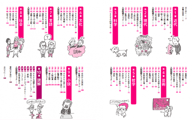 本書では、「近代」「現代」「科学」「芸術」などの10章に分け、その章をさらにそれぞれ6コアに分けて、現代文試験に頻出の“全60テーマ”をピックアップ。各項目を、とにかくわかりやすい「話し言葉」で解説し、コンパクトなストーリーに仕上げています。