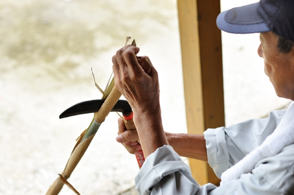 凧の材料になる植物の加工を見学する