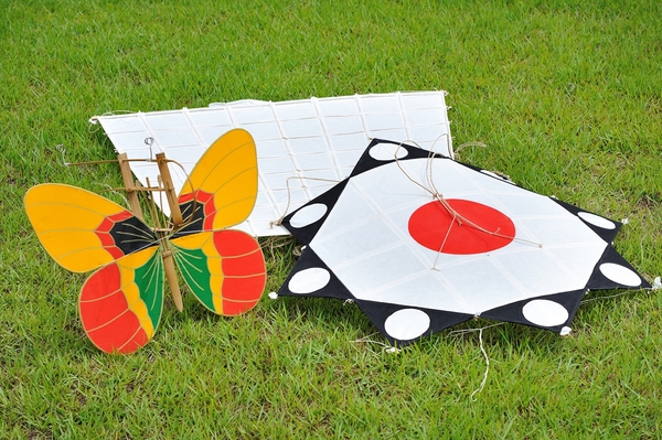 自作した伝統凧で凧あげをする
