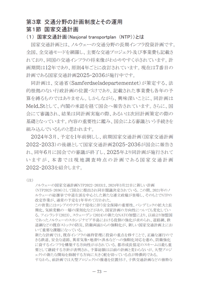 本書は、土木学会が2022年に提言した「Beyondコロナの日本創生と土木のビッグピクチャー」を具現化するため、3年に及ぶ調査研究の成果をまとめたものです。ノルウェーの国・県・市の計画体系を規定する「計画・建設法」、投資規模と整備目標を明示した「国家交通計画(NTP)」、計画の実現への段階的な事業評価や公衆参加の仕組み等を、公開文書とヒアリングにより具体的に解きほぐします。長期的なインフラ投資計画とその実行性を担保する計画の仕組みを題材として、透明性を高めることでむしろ計画を着実に前進させ、国民の納得感へ繋げている点等を明らかにし、わが国の計画制度へのヒントを提示します。
