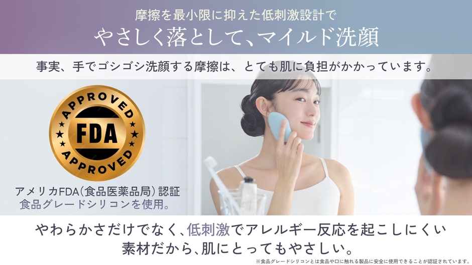 毎日使うものだから、肌に直接触れる素材にもこだわりました。FDA認証の食用グレードシリコンを採用し、低刺激で敏感肌の方にもやさしい設計になっています。摩擦を抑えた極細ブラシが肌を傷つけにくく、やさしくしっかり汚れをオフ。もちろん完全防水仕様でお風呂でもつかえます。水洗いして、いつでも清潔に保てるので、毎日のスキンケアに安心してお使いいただけます。