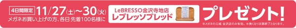 11/27(土)~11/30(火)の4日間、OPEN記念としまして、メガネお買い上げの方、各日先着100名様に「LeBRESSO(レブレッソ)」の食パンをプレゼントいたします!