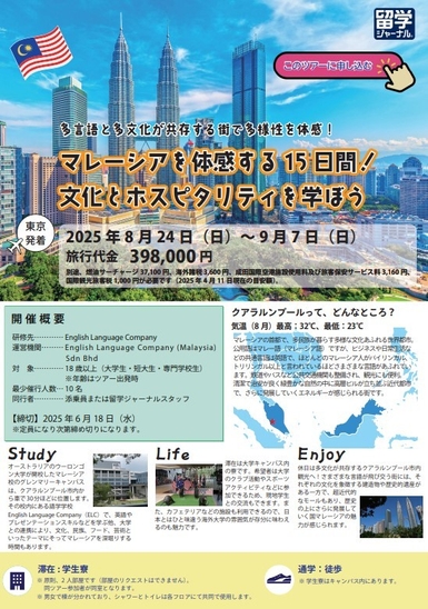 株式会社留学ジャーナル (所在地:東京都新宿区、代表:塚田 俊文)は、大学生、短大生、専門学校生、専修学校生を対象にした「2025年8月出発 マレーシア文化とホスピタリティを学ぶ15日間」の参加者を募集します。