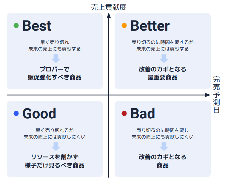 全ての在庫を対象に、在庫リスク(完売予測日)と売上・利益に対する貢献度の2軸で評価し、可視化します(下図参照)。
