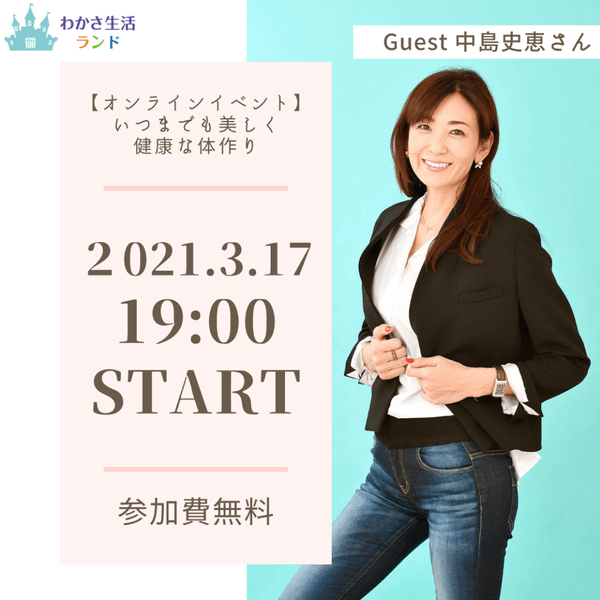 そんなわかさ生活ランドで、タレント・ヨガインストラクターとしても活躍されている中島史恵さんをゲストにお招きし、「いつまでも美しく健康な体作り」をテーマにオンラインイベントを開催いたします。