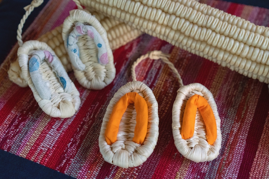 トウモコロシの皮を材料にスリッパを作る青森県の伝統工芸品「きみがらスリッパ」。かつて国内有数の馬産地だった青森県で、馬の飼料であるトウモロコシの残った皮を活用したことで生まれ、農閑期の冬に家庭で作られてきました。その周期に従い、今冬、青森屋で育てたトウモロコシの皮を材料に、スリッパの約三分の一の大きさのミニぞうり作りを実施します。スリッパの場合、熟練の職人でも1足につき1日をかけ製作しますが、ミニぞうりは殆ど同じ工程で進めながら、滞在中の限られた時間内で編めます。自宅や身の回り品に飾って楽しめるように、使用する皮や鼻緒の布は好きな色を選べるほか、かかと部分を補強するのにちりめんを差し込むなど、組み合わせ次第で自分だけの作品を作れます。