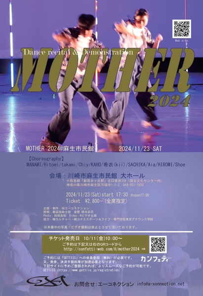 有限会社エーコネクション(代表:荒井 修)企画・制作、「MOTHER 2024」が2024年11月23日 (土・祝)に川崎市麻生市民館(神奈川県川崎市麻生区万福寺1-5-2)にて開催されます。