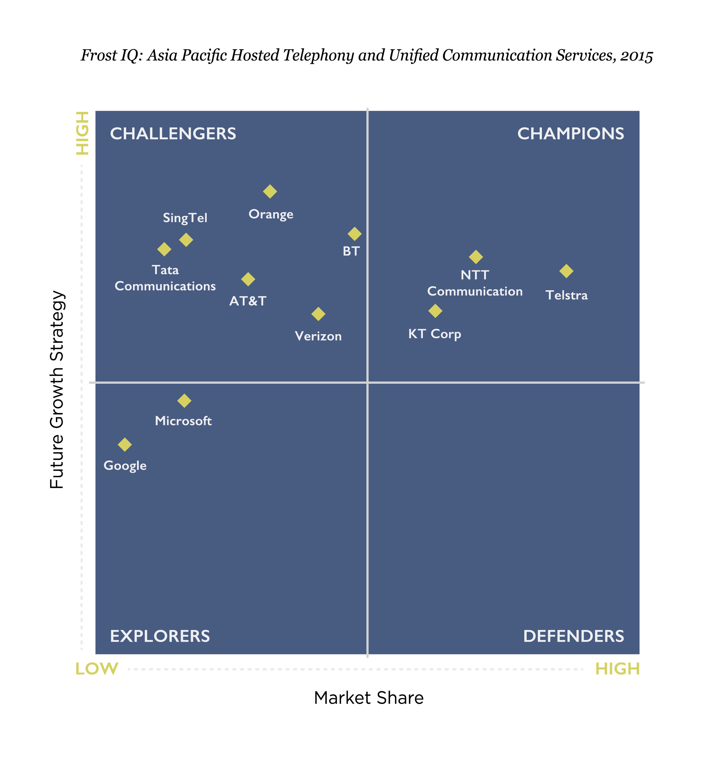 NTTコミュニケーションズ株式会社(略称:NTT Com)は、Frost & Sullivan社が発行した「Frost Industry Quotient(IQ)- Asia Pacific Hosted Telephony and Unified Communication Services Providers, 2015」レポートにおいて、市場シェアと将来の成長戦略に基づいた評価により、その双方が高い「チャンピオン」のポジションに2年連続で位置付けられました。