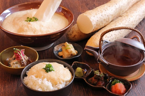 掘った長芋は、青森屋で食べることができます。長芋をおいしく味わってもらうために、提供するのは、長年長芋に携わってきた農家だからこそ知る料理です。まずは自分で掘った長芋の素材を味わうために、とろろにしてごはんと一緒に食べます。次にわさびやねぎなど、好きな薬味を加えて、風味を変えて味わい、最後にだし汁をかけ、だし茶漬けにして楽しめます。ほかにも、農家がおすすめする長芋料理を4品提供します。
